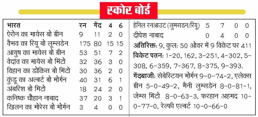 26वें ओवर में वैभव सूर्यवंशी तीसरे विकेट के रूप में आउट हुए। उन्हें मैनी लुम्सडेन की गेंद पर विकेट के पीछे थॉमस रियू ने कैच आउट किया। वैभव सूर्यवंशी ने 80 गेंदों में 15 चौके और 15 छक्के लगाते हुए 175 रनों की विस्फोटक शतकीय पारी खेली। इस दौरान वह अंडर-19 की एक पारी में सर्वाधिक छक्के लगाने वाले बल्लेबाज बन गए। इसके अलावा उन्होंने यूथ वनडे में सर्वाधिक 1412 रन बनाने का भी रिकार्ड बनाया। उन्होंने विजय जोल 1404 रन के रिकार्ड को तोड़ा। वैभव के आउट होने के बाद भारत के रनों की रफ्तार थम गई और विकटों का पतन शुरु हो गया। विहान मल्होत्रा (36), अम्ब्रिश (18) और खिलन पटेल (तीन) रन बनाकर आउट हुये।