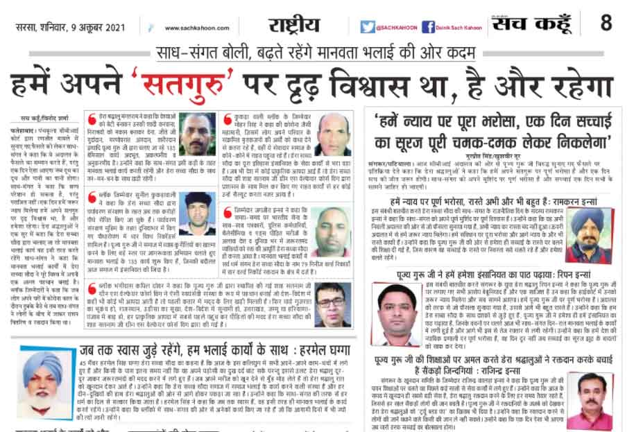 सीबीआई अदालत की ओर से जो पूज्य गुरू जी के खिलाफ फैसला सुनाया गया है, उससे साध-संगत को रत्ती भर भी फर्क नहीं आया है क्योंकि हमारे देश की न्यायिक व्यवस्था इससे भी आगे है, हमें पूर्ण यकीन है कि सच्चाई एक दिन जरूर बाहर आ जायेगी। हमारा समूह परिवार पिछले लंबे समय से डेरा सच्चा सौदा के साथ जुड़ा हुआ है। उन्होंने कहा पूज्य गुरू जी ने हमेशा ही उनको मानवता भलाई के कार्यों की शिक्षा दी है, जिसको ग्रहण करते हमारा समूह परिवार लंबे समय से समाज भलाई के कार्यों में लगा हुआ है। उन्होंने कहा कि डेरा सच्चा सौदा में तो यदि कोई सांप या कोई जहरीला जानवर आ जाये तो उसे पकड़ कर दूर छोड़ दिया जाता है। डेरा सच्चा सौदा की सोच इन बेजुबानों के लिए इतनी दयालू है तो वह किसी व्यक्ति का जानी नुक्सान कैसे सकते हैं या सोच भी सकते हैं।
