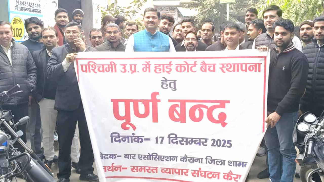 पश्चिमी उत्तर-प्रदेश में उच्च न्यायालय खंडपीठ स्थापित किये जाने की मांग को लेकर केंद्रीय संघर्ष समिति की ओर से बुधवार को वेस्ट यूपी में सम्पूर्ण बंद का आह्वान किया गया था। इसी के मद्देनजर जनपद बार एसोसिएशन कैराना के अधिवक्ताओं ने बुधवार को कार्य बहिष्कार करके प्रातःकाल से ही अपने चैंबर बंद रखे। उन्होंने सब-रजिस्ट्रार कार्यालय पर पहुंचकर वहां ताला जड़ दिया। इसके बाद, अधिवक्ताओं ने बैनर के साथ में कचहरी से चौक बाजार तक नारेबाजी करते हुए पैदल मार्च किया। उन्होंने अधिवक्ता एकता जिंदाबाद, वेस्ट यूपी में हाई कोर्ट बेंच लेकर रहेंगे आदि के गगनचुंबी उद्घोष लगाए। पैदल मार्च के बाद अधिवक्ता कस्बे के चौक बाजार में पहुंचे तथा धरने पर बैठ गए।