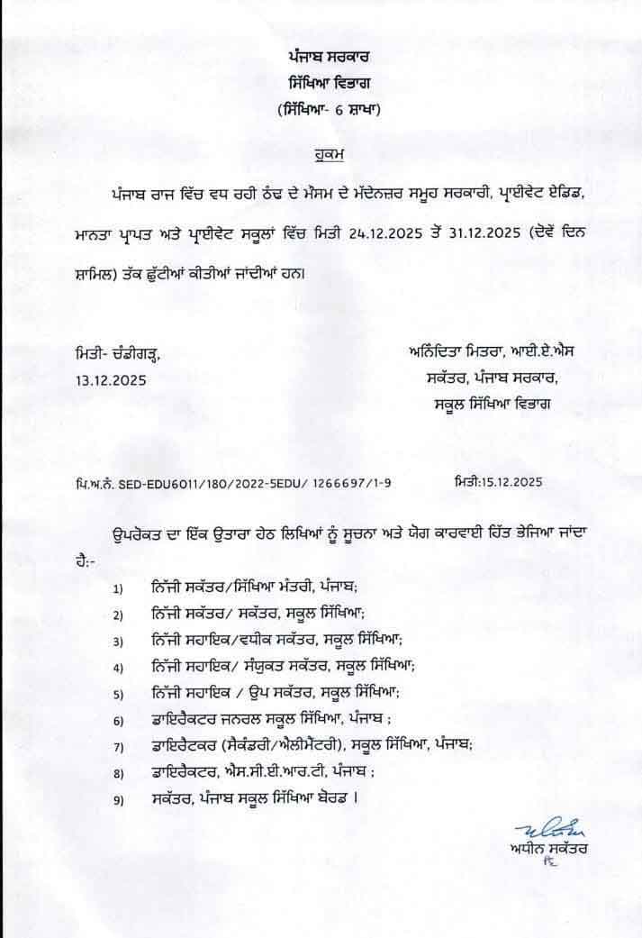 चंडीगढ़ (अश्विनी चावला)। पंजाब में सर्दियों की छुट्टियों का ऐलान कर दिया गया है। इसके लिए शिक्षा विभाग ने एक लेटर जारी कर पंजाब के सभी सरकारी और मान्यता प्राप्त स्कूलों, जिसमें गैर-सरकारी स्कूल भी शामिल हैं, को इन छुट्टियों के आदेशों को लागू करने को कहा है। शिक्षा विभाग के लेटर के मुताबिक, पंजाब में सर्दियों की छुट्टियां 24 दिसंबर से शुरू होकर 31 दिसंबर तक चलेंगी। Winter Vacations Punjab